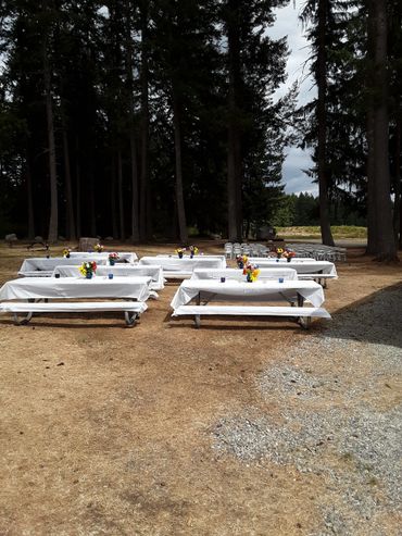 We have 60" round tables, 72" and 96" rectangular tables, all seating 8 each, with approximately 250 chairs for your use as well.